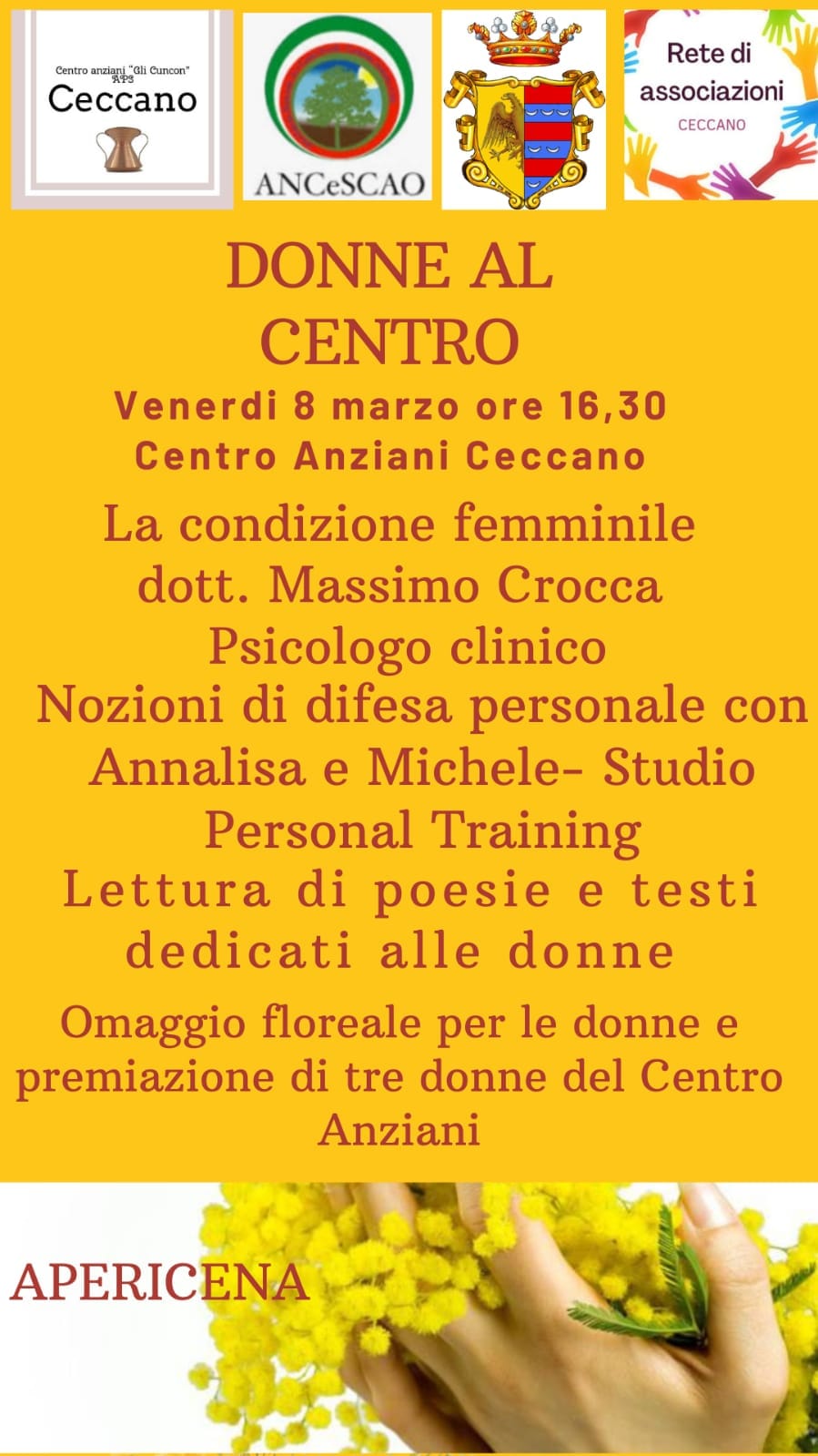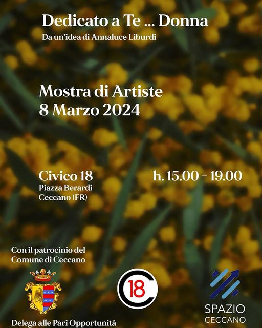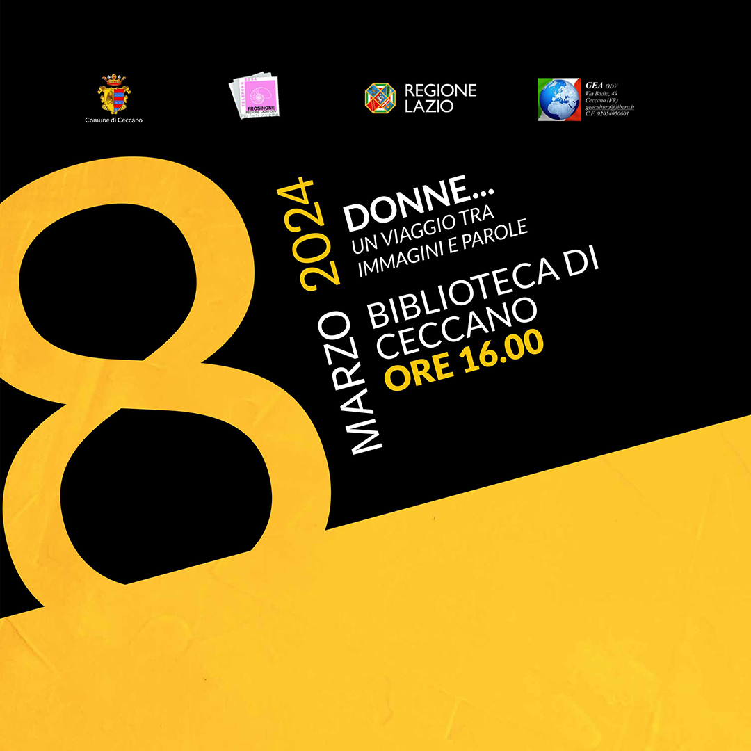 Si comincia nella mattinata, anche se a Frosinone, nel Palazzo dell’Amministrazione Provinciale, con l’Associazione Famiglia Futura di Ceccano che organizza Non solo mimose, le donne si raccontano, in cui interverranno il procuratore della Repubblica di Frosinone, dott. Antonio Guerriero, e uno dei suoi sostituti, la dott.ssa Rossella Ricca, insieme ad Angela Nicoletti, giornalista, e Nadia Patrizi, avvocato. Nella manifestazione saranno impegnati, insieme ad altre scuole, anche gli allievi del Liceo di Ceccano. L’inizio è fissato alle 9. Nel pomeriggio due appuntamenti: nella biblioteca comunale di Ceccano alle ore 16 ci sarà Donne, un viaggio tra immagini e parole, organizzato dal Comune di Ceccano, con poesie, testi, musica e la premiazione degli allievi delle scuole che hanno partecipato al Contest Io dico no alla violenza sulle donne. Alle 16,30, presso il Centro Anziani in via S. Pietro, per iniziativa dell’Associazione Gli Cuncun insieme alla rete delle Associazioni coordinata dalla Proloco, ci sarà Donne al centro con l’introduzione dello psicologo clinico Massimo Crocca, sul tema della condizione femminile oggi. Seguiranno poi la lettura di testi e poesie dedicati alle donne e una dimostrazione pratica di difesa personale, con lo Studio personal training. Ci saranno quindi omaggi floreali per tutte le donne presenti, una premiazione e un apericena.