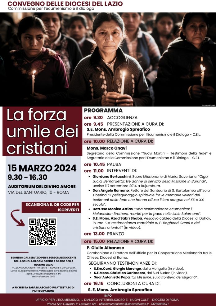 La forza umile dei cristiani è il tema del convegno che mons. Spreafico, vescovo delle diocesi di Frosinone Veroli Ferentino e Anagni Alatri, aprirà venerdì 15 marzo, alle 9,30, al Divino Amore a Roma, in qualità di presidente della commissione episcopale per l’ecumenismo e il dialogo. E’ organizzato dalla Commissione per l’Ecumenismo e il dialogo Interreligioso del Lazio e vuole mettere al centro dell’attenzione le storie, spesso dimenticate, di quanti oggi danno la loro vita per la fede. Insieme al vescovo Spreafico interverranno don Marco Gnavi, segretario della commissione per il dialogo e P. Giulio Albanese, Direttore dell’Ufficio Missionario della Diocesi di Roma. Con loro tante testimonianze di un vescovo caldeo, due cardinali, missionari, L’epoca di cambiamento che noi tutti viviamo è accompagnata da sconvolgimenti globali, spesso sotto il segno di una violenza impazzita, del conflitto armato, del terrore, insieme a sistemi di sfruttamento ingiusti che immiseriscono tanta parte dell’umanità e feriscono il creato. Questo quadro di crisi, tuttavia, è il terreno nel quale i cristiani testimoniano la loro adesione al Vangelo, divenendo riserva di speranza nei crocevia della storia più impervi. Pastori, laici, religiose e religiosi, membri della Chiesa cattolica, ma anche ortodossi, come pure anglicani, evangelici di diverse appartenenze, muoiono uccisi in Africa, Asia e Medio Oriente, America Latina, Oceania, talvolta in Europa, fronteggiando il male nelle sue diverse espressioni, con la forza umile del bene. Sono disarmati, amano la vita e la proteggono in tutte le sue forme e per questo impensieriscono quanti, al contrario, idolatrano prevaricazione, spoliazione, denaro e offerte di morte. Il Convegno, nella sua prima parte, intende aprire uno spazio di consapevolezza sulla loro testimonianza, svelando la bellezza di vite spese in nome di Gesù, nella carità, con la resilienza della fede. Sono annunciatori di speranza, nella loro stessa debolezza, sino al dono estremo della vita. Nel corso del pomeriggio, si allargherà invece lo sguardo alla missione, lì dove il nome di Gesù è ancora sconosciuto, o dove viene annunciato in forme nuove, quale principio di bene, di riconciliazione, o quale germoglio di Chiesa nascente e nuova riconciliazione.