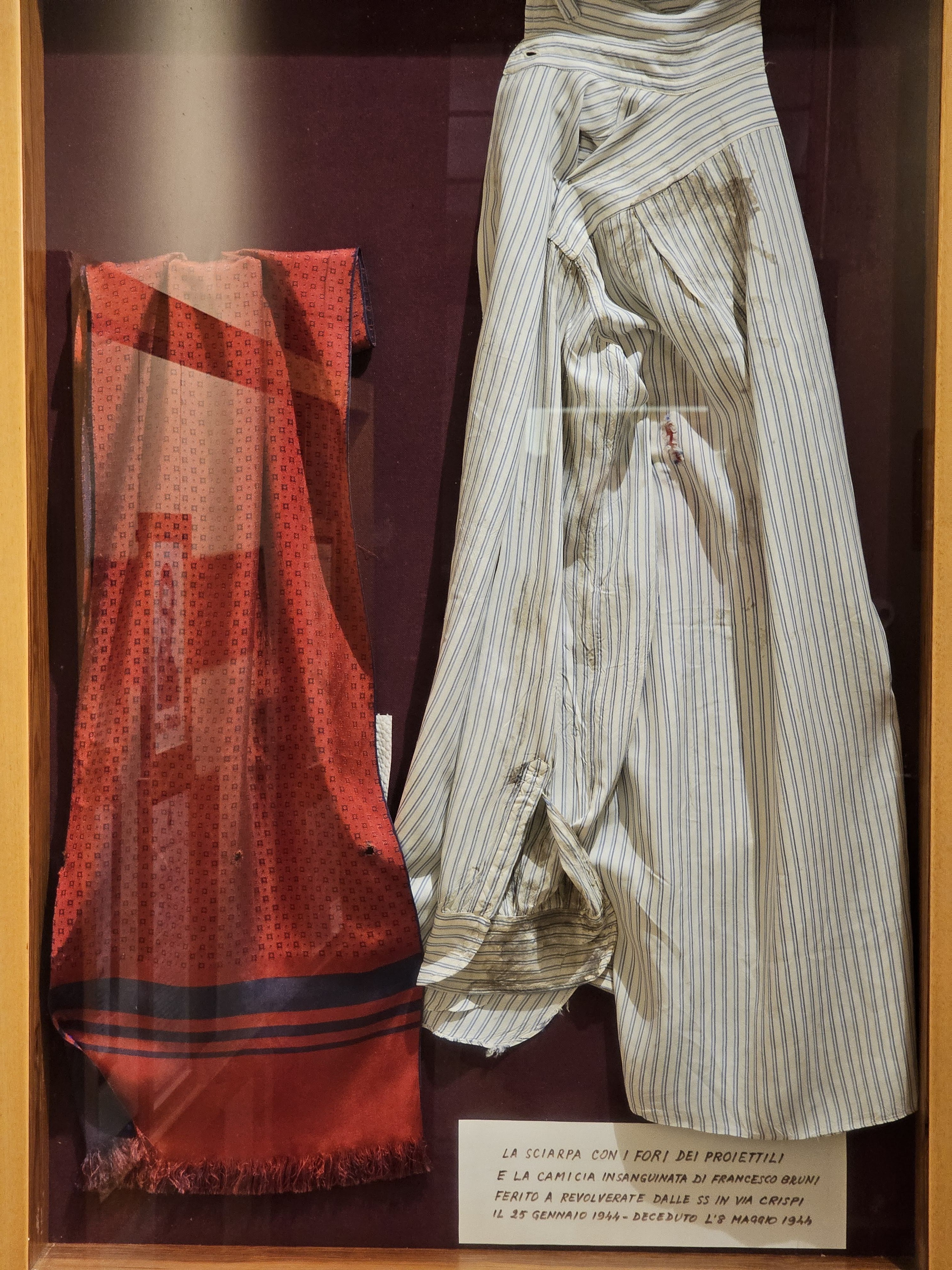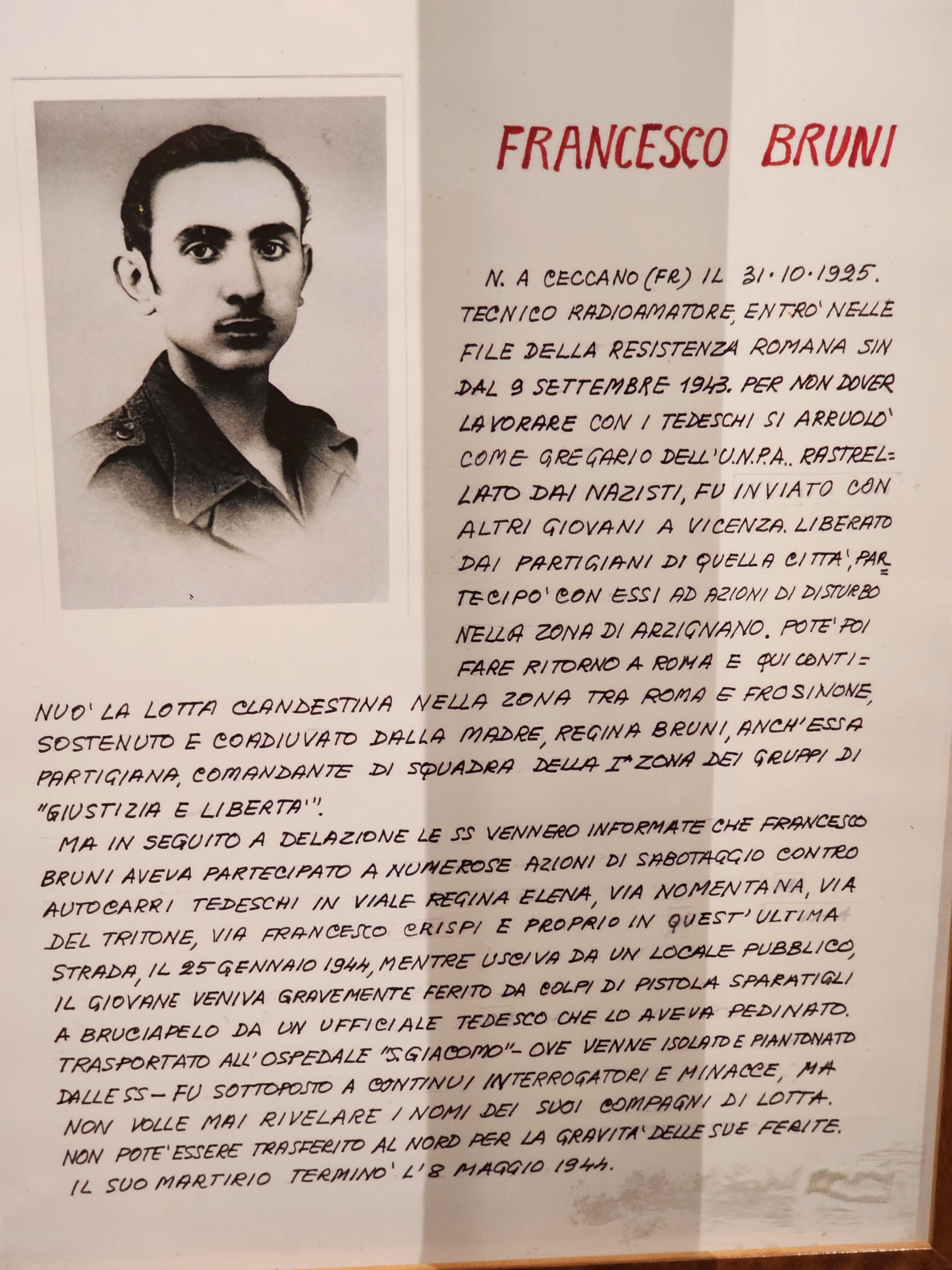 Non c’è soltanto Luigi Mastrogiacomo, trucidato dai nazifascisti proprio 80 anni fa, alle Fosse Ardeatine, dopo essere stato arrestato perché conservava una ricetrasmittente nel barcone di cui era custode. Il Museo della Liberazione in via Tasso, dove la Gestapo aveva installato le sue prigioni speciali, ricorda anche Francesco Bruni, nato a Ceccano nel 1925, attivo nella Resistenza romana, nelle formazioni della contraerea. Colpito a bruciapelo con due colpi di pistola, il 25 gennaio 1944, in via Crispi, da un ufficiale delle SS che lo pedinava, morì l’8 maggio, a 19 anni, dopo atroci sofferenze, per le torture cui fu sottoposto, mentre era ricoverato al San Giacomo. Del giovane Bruni, il Museo conserva la camicia macchiata dal suo sangue e la sciarpa rossa, crivellata dai due proiettili. Luigi Mastrogiacomo è ricordato a Ceccano da una lapide, un po’ trascurata, in Piazza Municipio, e completamente ignorata nell’80° della morte, tanto da suscitare le proteste dell’ANPI, l’Associazione Partigiani di Ceccano. Ne meriterebbe, però, una anche Francesco Bruni.