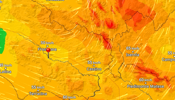 Sono previste raffiche superiore ai 50 km orari. Ecco la rappresentazione grafica che ne dà il sito meteoradar.it per le ore 14 di mercoledì 27 marzo 2024