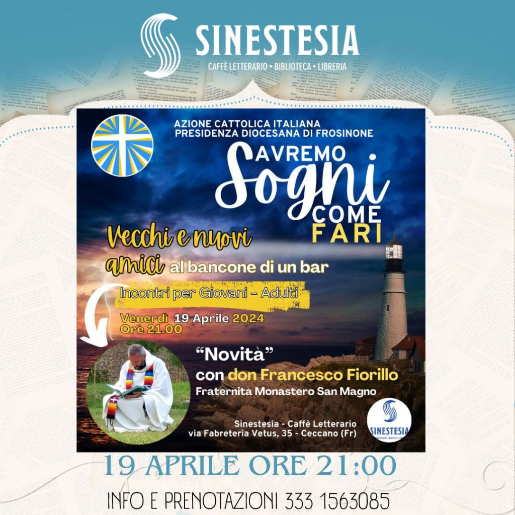 Avremo sogni come fari: si presenta così l’incontro che l’Azione Cattolica propone a tutti coloro che lo vorranno venerdì 19 aprile, alle ore 21 al caffè letterario Sinestesia a Ceccano, con il sottotitolo vecchi e nuovi amici al bancone di un bar. Una formula sicuramente innovativa che dura ormai da qualche mese e che stasera avrà come ospite don Francesco Fiorillo, dalla Fraternità del Monastero di San Magno a Fondi. L’incontro è aperto a tutti.