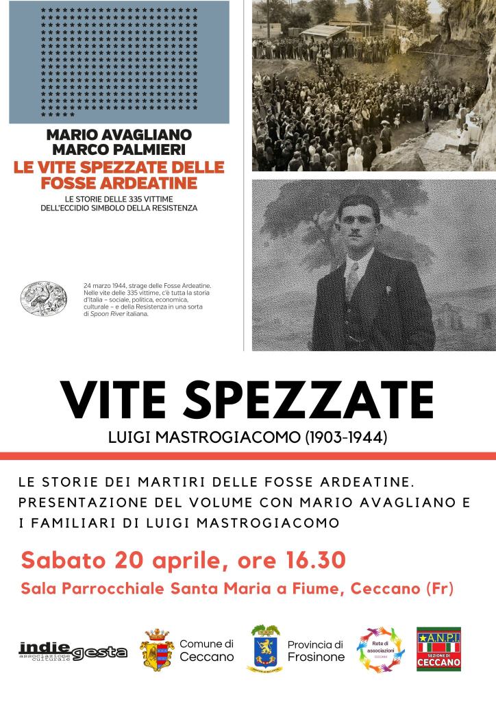 A 80 anni dall’eccidio delle Fosse Ardeatine, Mario Avagliano ha ricostruito le 335 vite spezzate in quel tragico 24 marzo 1944. Sabato 20 aprile, dalle 16.30, sarà a Ceccano, nella Sala Parrocchiale di Santa Maria a Fiume, per raccontare le storie dietro le vittime, con uno sguardo particolare al nostro concittadino Luigi Mastrogiacomo. L’incontro è organizzato da Indiegesta, con la collaborazione della rete delle Associazioni