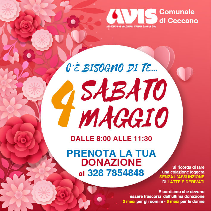 Andate a donare anche a Frosinone, al centro trasfusionale. C’è una grave carenza di sangue. E’ l’appello che l’Avis di Ceccano rivolge a tutti i donatori e a coloro che vogliano fare questo gesto di altruismo che può salvare una vita. La segretaria dell’Avis di Ceccano, Vanessa Carlini, ricorda anche che la prossima donazione è prevista sabato 4 maggio presso la nostra sede e che ci saranno altre raccolte straordinarie che verranno comunicate appena avremo date certe