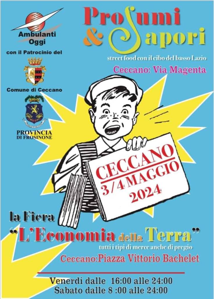 Profumi e sapori del Basso Lazio è il titolo della manifestazione di cibo da strada che si svolgerà a Ceccano da venerdì pomeriggio, 3 maggio, per tutta la giornata di sabato, con stand gastronomici e spettacoli musicali. Saranno interessate Piazza XXV Luglio, Largo Tomassini, Via Magenta, e i Piazzali Bachelet ed Impastato. Nell’ordinanza affissa all’albo, si legge che il divieto di transito e di sosta sarà in vigore dalle ore 14 alle ore 24 di venerdì 3 maggio e per l’intera giornata di sabato 4. Il traffico veicolare verrà dirottato sulle strade adiacenti la manifestazione.