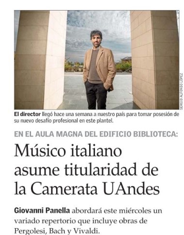 Con lo Stabat Mater di Pergolesi si inaugurerà a Santiago del Cile il periodo di direzione del m° Giovanni Panella, ceccanese doc, ora alla guida dell’orchestra dell’Università delle Ande. Il primo concerto ci sarà mercoledì 8 maggio. Con le nostre congratulazioni. In bocca al lupo, Giovanni! Nell’immagine, la pagina del quotidiano El Mercurio di Santiago del Cile.