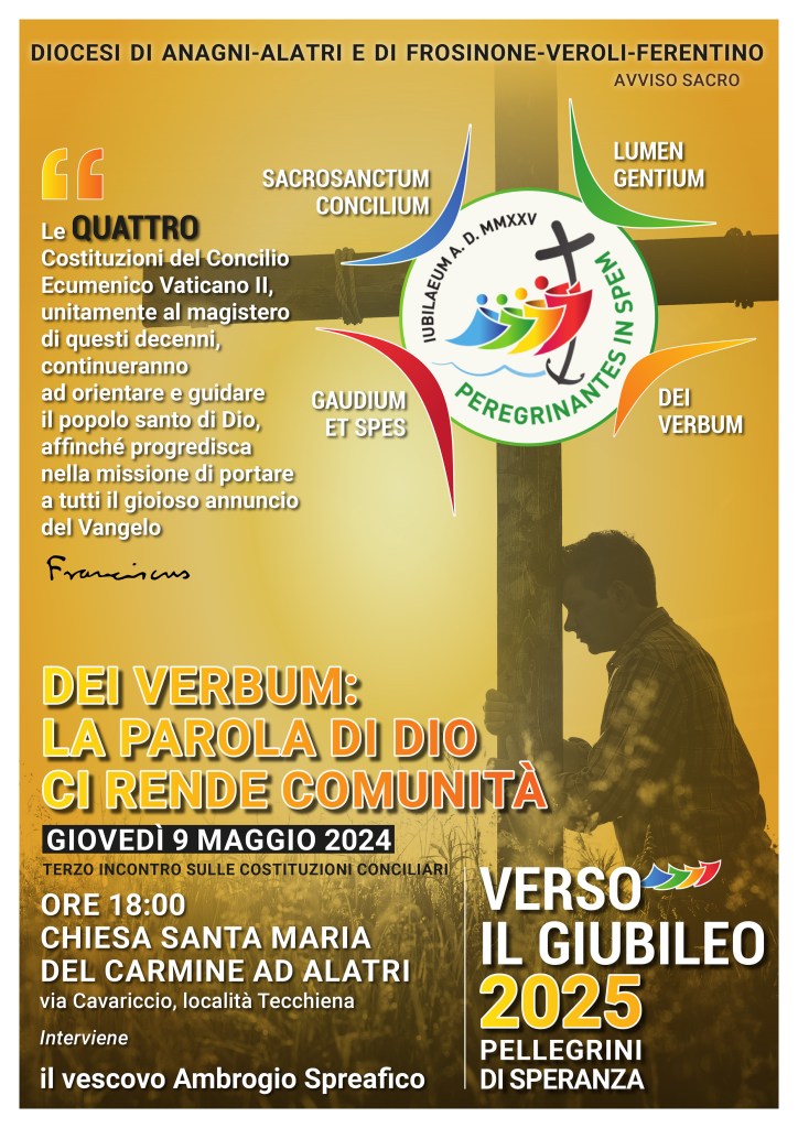 Dei Verbum: la Parola di Dio ci rende comunità è il tema della lezione che mons. Ambrogio Spreafico, vescovo di Frosinone e di Anagni-Alatri, terrà a Tecchiena, nella Chiesa del Carmine, giovedì 9 maggio alle ore 18. Si tratta del terzo appuntamento di quattro incontri dedicati a ciascuna delle quattro Costituzioni del Concilio Ecumenico Vaticano II. L’iniziativa è organizzata dalla Diocesi di Frosinone-Veroli-Ferentino insieme a quella di Anagni-Alatri: la partecipazione è gratuita e l’invito è rivolto a tutti. Si tratta di occasioni di approfondimento e di preparazione al prossimo Giubileo, dal tema “Pellegrini di speranza“.