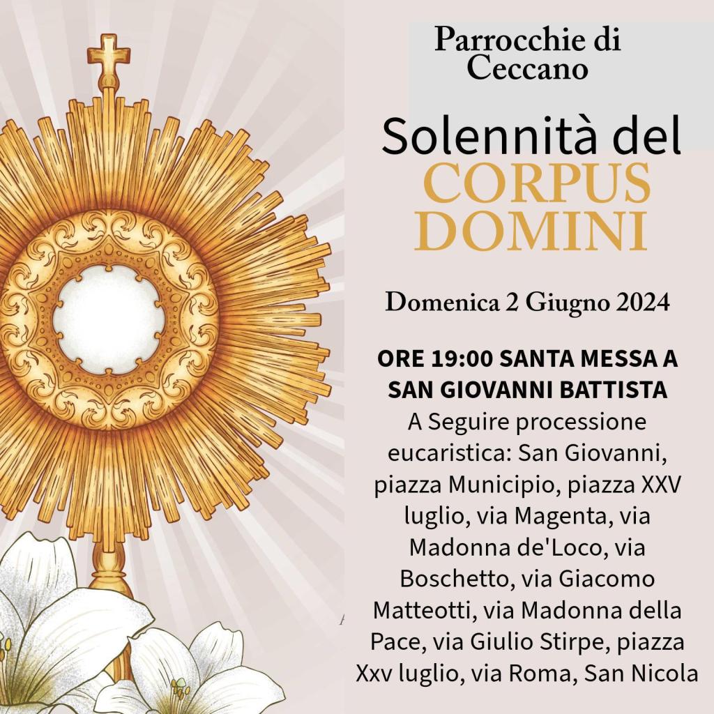 Le Parrocchie di Ceccano si ritroveranno a San Giovanni alle ore 19 per la celebrazione della Santa messa poi la processione si snoderà attraverso Piazza Municipio , via Magenta , via Madonna De Loco via Boschetto, via G. Matteotti , via Mad. della Pace , via Giulio Stirpe , Piazza XXV Luglio via Roma ed rientrerà a San Nicola.