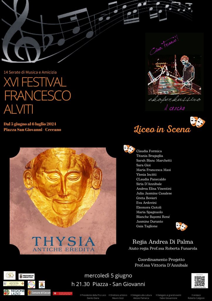 Saranno le ragazze del laboratorio teatrale del Liceo di Ceccano ad inaugurare la XVI edizione del Festival Francesco Alviti. Lo faranno con il grande teatro greco, quello della cultura che ha inventato la rappresentazione teatrale in quanto tale. Presenteranno Thysìa. Thysìa significa sacrificio. Quel sacrificio che sembra contraddistinguere la natura umana; d’altronde anche la parola “tragedia” ha all’interno la natura sacrificale: “il canto del capro”, questo significa tragedia, quel canto del capro nell’atto sacrificale durante i riti dionisiaci. Si parte da Edipo e da sua figlia Antigone, da Prometeo, dalla regina di Troia Ecuba per poi arrivare agli Atridi, ossia Agamennone, sua moglie Clitennestra, la loro prima figlia Ifigenia,