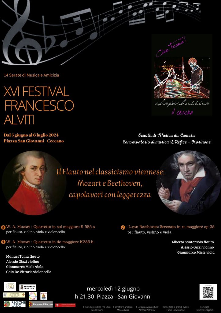 Arrivano Mozart e Beethoven al Festival Francesco Alviti a Ceccano, con la riproposizione dell’ambiente musicale di Vienna tra la fine del ‘700 e l’inizio dell’800. Sarà affidata alla Scuola di musica da camera del Conservatorio di Frosinone, diretta da Francesca Vicari, che presenterà due quartetti di Mozart e una serenata di Beethoven, per un concerto dedicato alla leggerezza. Suoneranno Manuel Toma e Alberto Santorsola, flauto, Alessio Gizzi violino, Gianmarco Miele viola, Gaia De Vittoris violoncello. Si tratta del primo dei 4 concerti in collaborazione con il Conservatorio Licinio Refice di Frosinone. Il terzo appuntamento del festival arriva dopo il grande successo di pubblico del teatro greco e del coro e dell’orchestra del Liceo di Ceccano che hanno inaugurato il Festival Francesco Alviti 2024, giunto alla XVI edizione. Piazza San Giovanni offriva un grande spettacolo di pubblico, a testimonianza ulteriore di come il Festival sia entrato stabilmente nel panorama culturale del territorio. Il Festival proseguirà quindi il 17 giugno: ci sarà il recital pianistico di Riccardo Tiberia, che presenterà un programma di autori del Romanticismo. Si cambierà completamente stile il 19 giugno con la Scolopendra Band e le canzoni di Federico Palladini. Il 22 giugno, antivigilia della Festa di S. Giovanni Battista, stavolta alle 18,30, nella chiesa collegiata ci sarà l’esecuzione del solenne Te Deum di Marc-Antoine Charpentier, affidato al Coro Josquin Des Pres, diretto da Guido Iorio. Curerà anche l’esecuzione del Vespro solenne, proprio la vigilia della festa, il 23 giugno, alle ore 18. Sempre lo stesso giorno, alle ore 19, ci sarà l’opportunità di ascoltare le note suggestive dell’organo Catarinozzi, uno strumento costruito nel 1736, appositamente per la chiesa di S. Giovanni. Lo suonerà il grande organista Juan Paradell Solé, catalano, già organista nella Basilica di S. Pietro. Con lui la flautista Camilla Refice. Il 25 giugno, si tornerà in piazza S. Giovanni, orario solito alle 21,30, con il concerto della Banda Giovanile della Città di Ferentino, diretta da Luigi Bartolini, cui seguirà, il giorno successivo, 26, quello dell’Orchestra di Fiati di Ferentino, diretta da Alessandro Celardi. Il 27 giugno saranno di scena l’Ensembe Flute Friends e i Flauti di Dragona, insieme a il Dialogo armonico, per liuto e voce. Il giorno successivo, 28 giugno, saranno di scena i percussionisti del Conservatorio di Frosinone, guidati da Carlo Di Blasi. Il Festival proseguirà poi il 30 con un altro concerto a cura del Conservatorio dal titolo Per cantare e suonare con ogni sorta di strumento, con gli allievi guidati da Maria Rosaria Agresti e Rodolfo La Banca. Il giorno dopo sarà la volta della lirica, con Un palco all’opera, con la Serata Puccini, diretta da Mauro Gizzi. Gran finale il 6 luglio, con due marching band, quella di Amaseno, diretta da Natalino Como, e una proveniente dal Centroamerica, dal S. Salvador. Il festival, la cui direzione artistica è curata da Mauro Gizzi, è organizzato dalla Pro Loco di Ceccano, dall’Associazione Francesco Alviti, con la Rete delle Associazioni, in collaborazione con il Conservatorio di Frosinone, gode del patrocinio della Regione, di Provincia creativa e del Comune di Ceccano e si basa soprattutto sulla grande disponibilità degli amici di Francesco.