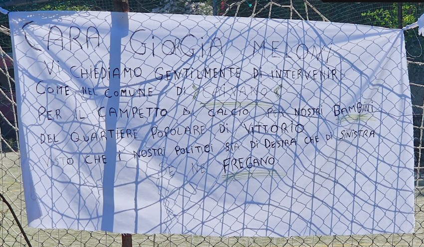 Hanno usato lo stesso metodo di Scampia: lenzuola come manifesti, tazebao si sarebbe detto qualche decennio fa, attaccate alle reti contorte del campetto da calcio, abbandonato ormai da anni in condizioni pessime e pericolose. Il messaggio è chiarissimo: a Ceccano, gli abitanti del quartiere Di Vittorio si sentono abbandonati e chiedono al presidente del consiglio un modello Caivano anche qui. Sulle lenzuola è scritto: Cara Giorgia Meloni, ti chiediamo gentilmente di intervenire, come nel comune di Caivano, per il campetto di calcio per i nostri bambini del quartiere popolare Di Vittorio, visto che i nostri politici sia di destra che di sinistra se ne fregano. E l’altro: Siamo stati abbandonati dal nostro paese, il quartiere Di Vittorio non esiste.