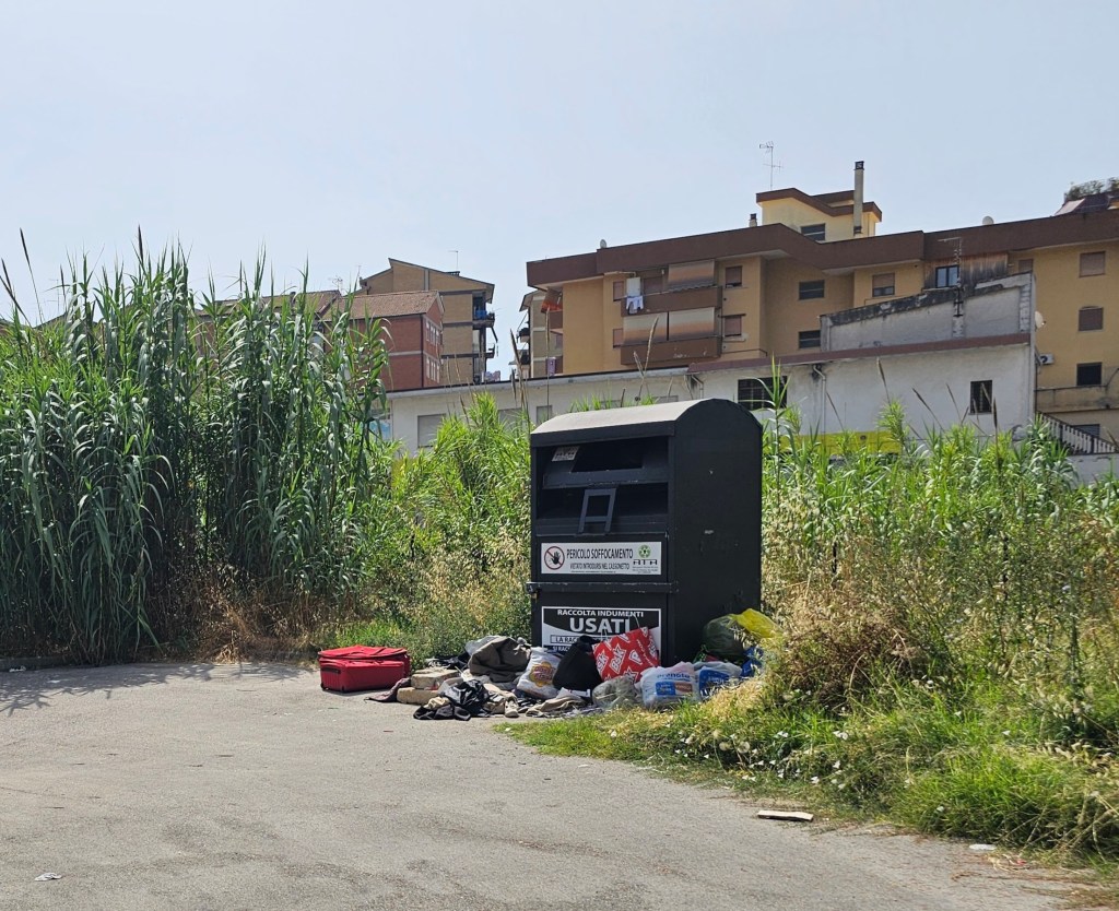 Sono quelle che si formano accanto ai contenitori per la raccolta dei vestiti usati. Come si può vedere dalle foto scattate stamane vi vengono depositati accanto rifiuti di ogni genere, diventando vere e proprie discariche urbane, in barba alla raccolta differenziata. Ci sarebbe da chiedersi con quale frequenza vengano svuotate. Basterebbe poco per scoraggiare il fenomeno, diminuendo sia gli intervalli fra uno svuotamento e l’altro e soprattutto installando qualche dispositivo di sorveglianza. Accanto ai rifiuti ci sono poi sterpaglie di ogni genere, fin sui marciapiedi, come nell’area che avrebbe dovuto ospitare l’isola ecologica a Via Di Vittorio, poi spostata inspiegabilmente, come le altre, all’interno di una scuola. Tutte le situazioni sono state segnalate alla Polizia Municipale