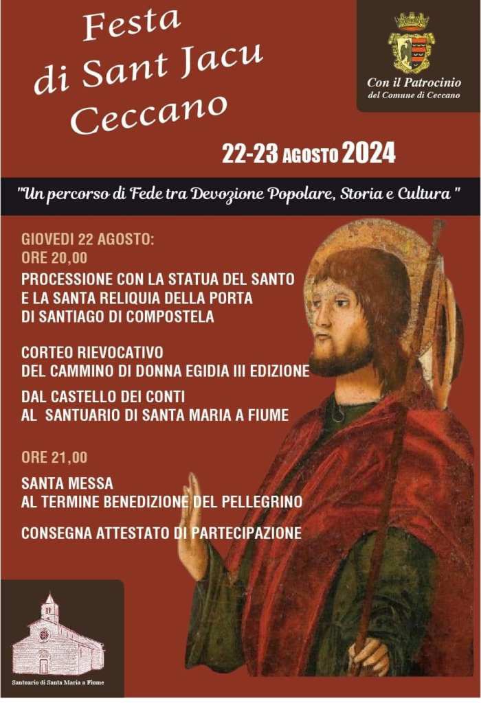 Ci sarà giovedì 22 agosto, dalle ore 20, la processione con la statua del santo e la reliquia della porta santa di Santiago di Compostela. Si snoderà da Piazza Mancini fino al Santuario di S. Mxaria a Fiume, accompagnata da un corteo rievocativo. Ricorda l’antica devozione che lega Ceccano a San Giacomo, nella venerazione di Compostela. Nei pressi del ponte sorgeva la chiesa dedicata a San Giacomo, attorno alla quale si svolgeva una fiera del bestiame, che affonda le sue origini nella storia della Contea dei de Ceccano: il culto di San Giacomo a Ceccano è attestato da una notevolissima quantità di documenti che confermano l’importanza del pellegrinaggio di Egidia, una delle prime donne ad arrivare in Galizia, alla tomba di San Giacomo, in finibus terrae. Il figlio Giovanni, dopo quel pellegrinaggio, fece edificare due chiese S. Maria a fiume, consacrata nel 1196, con grande concorso di cardinali vescovi ed abati, e poi, nel 1209, la chiesa di S. Giacomo ad pontem, scomparsa poi nel secolo XVIII, probabilmente trascinata via da una piena. Attorno a queste chiese, appunto, si svolgeva una grandissima fiera nel giorno della Festa di San Giacomo, il 25 luglio. Una venerazione tanto radicata che il dialetto ha conservato l’espressione ispanica: Sant’Iacu d’ Galizia. Furono poi i Colonna, nel secolo XVI, a spostare di un mese la fiera per non farla coincidere con un’altra dei propri possedimenti. In entrambe le chiese, fra le reliquie, furono inseriti anche i resti delle vesti liturgiche di San Tommaso Beckett, arcivescovo di Canterbury, assassinato dai sicari del re d’Inghilterra nella sua cattedrale. A san Tommaso i de Ceccano erano particolarmente devoti, come narrato nella ricerca storica condotta dal Liceo di Ceccano