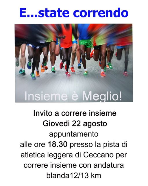 Lo lancia Gerardo Gatta, organizzatore e runner per il Corridore running: corriamo insieme, andatura blanda, 12/13 km. Ceccano, ha una splendida pista di atletica ad 8 corsie, addirittura con doppia partenza per i 110hs, assolutamente sottoutilizzata. potrebbe essere il segno di una svolta. Perché non affidare la pista alle Associazioni sportive?