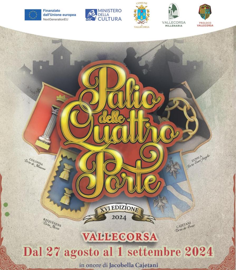 Il palio mette in competizione le 4 porte medievali del paese e le contrade ad esse collegate. Ad ogni porta sono stati associati 4 personaggi storici relazionati tra di loro ed al paese. O perché antichi signori, o perché attuali amministratori o perché vantavano pretensioni sulla baronia di Vallecorsa nella contea di Fondi dalle origini. I 4 personaggi sono anche legati tra di loro perchè protagonisti a vario titolo nella Battaglia di Lepanto. Ed infatti ci troviamo nel 1572, quando di ritorno da Lepanto, prima di raggiungere Roma, si ritrovano a Vallecorsa per rendere omaggio in un palio all’antica signora del Borgo Jacobella Caetani. Figlia di Onorato I Caetani, il fautore dell’elezione a Fondi dell’Antipapa Clemente VII, fu sconfitta da Ladislao Durazzo d’Angiò e costretta in esilio a Vallecorsa dove visse dal 1400 al 1412, e dove anche vi morì il 31 luglio appunto del 1412, dopo aver fatto testamento a favore della Chiesa, dello zio Giacomo e di re Ladislao. In precedenza lo stesso sovrano si era rivolto a Jacobella, chiamandola magnifica nostra signora, contessa di Fondi e Despotessa di Romània, un titolo antichissimo risalente a Manfredi di Svevia, trasmesso poi agli Angioini quindi alla madre di Jacobella, Caterina del Balzo. Il re aveva stipulato un trattato i Capitoli di pace e di concordia, per poi rimangiarsi tutto ed esiliare la contessa. I 4 personaggi associati alle porte sono: Luis de Requesens luogotenente di Giovanni d’Austria a Lepanto, associato alla Porta Nòva, per la presenza in questa piazza del suo blasone (1565); il fratello Giovanni Zunica, rappresentante spagnolo della Lega Santa, committente del famoso polittico di Jacopo Zucci nella chiesa di Sant’Angelo, associato a Porta Sant’Angelo; Marco Antonio II Colonna, il vice ammiraglio di Lepanto, associato alla Porta de Missore, la porta principale del borgo, era in disputa con Isabella Colonna per il possesso dei castelli colonnesi di San Lorenzo, Sonnino e Vallecorsa; infine Onorato IV Caetani, comandante della fanteria pontificia a Lepanto, associato alla Porta de Suso, la portella del Castello, vantava antiche pretensioni sul feudo di Vallecorsa. Il Palio è un mix di storia, tardizione, cultura giochi popolari e modernità. Alla Quintana con i cavalli si affianca la staffetta, ma anche la vera novità di questi giochi gare attorno alla realizzazione di cortometraggi, scenografie, spettacoli canori, con giurie composte da professionisti del mondo dello spettacolo, del cinema, del teatro. Il Palio di Vallecorsa vanta un’antica tradizione, dal Medioevo alla Repubblica Romana, poi fu sospeso per problemi di ordine pubblico. Si svolgeva in occasione delle feste principali del paese, senza entrare nel dettaglio, consisteva in corse di cavalli e di giovanotti. Ne parla anche il Belli in un suo sonetto. Naturalmente tutto ebbe origine con il corteo di Ceccano ed il Liceo Scientifico. A Vallecorsa liquidarono il tutto dicendo che avevo copiato Ceccano, invece come vedi, a parte lo spunto ho reinterpretato in maniera originale, anche con l’aiuto dell’amico Giandrea Cipolla.