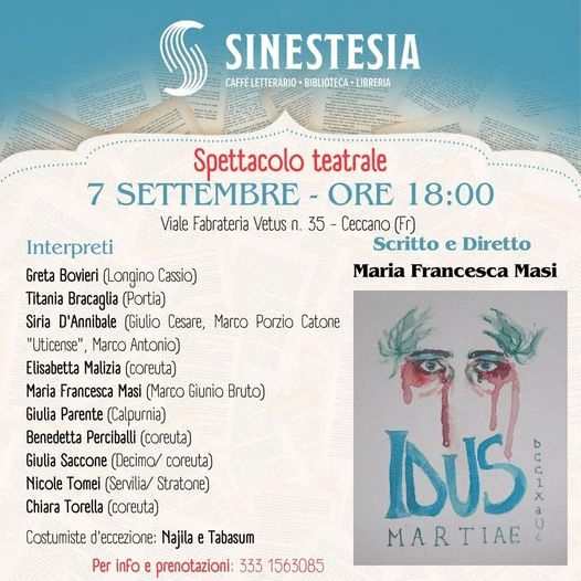 L’idea di mettere in piedi questo spettacolo nasce a fine maggio: avevo voglia di recitare, come avevamo fatto con il gruppo di teatro e quindi ho pensato che avrebbe potuto essere una buona idea per divertirsi. Ho chiesto a qualche ragazza del gruppo per recitare, a qualche compagna di classe per il coro e un paio di ragazze si sono unite a noi dopo. Abbiamo cominciato a fine giugno e ci siamo subito messe al lavoro, anche perché un’estate passa subito. Il coro, che ho ripreso dalle tragedie, è composto da Elisabetta Malizia, Benedetta Perciballi, Giulia Saccone e Chiara Torella. Il corpo dei personaggi principali è invece composto da Greta Bovieri come Cassio Longino, Titania Bracaglia come Porzia figlia di Catone, Siria D’Annibale che veste i panni di Cesare, Catone e Marco Antonio, Giulia Parente come Calpurnia e Nicole Tomei come Servilia, madre di Bruto. Vi presentiamo quindi “Le idi di marzo” e speriamo vi piaccia.
