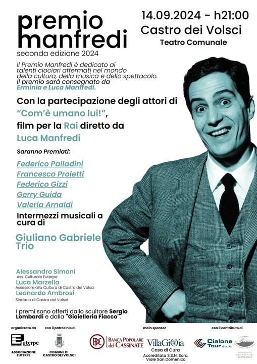 Sono il giovanissimo Federico Gizzi, già percussionista affermato, e Gerry Guida, esperto di cinema, curatore di tante ricerche sulla carriera dell’attore nativo di Castro dei Volsci. Riceveranno il premio intitolato a Nino Manfredi, stasera, 14 settembre, alle ore 21, nella sede della biblioteca comunale di Castro dei Volsci. Con loro sarà premiato anche Federico Palladini, insegnante al Liceo di Ceccano, cantautore, per il suo album Cantami Storie e leggende di Castro dei Volsci” realizzato con la Banda della Scolopendra (Massimo Campasso, Massimiliano Cerroni, Rosario Liberti e Paolo Tricca. I premi saranno consegnati dalla moglie del grande attore, Erminia. Più volte al comune di Ceccano è stato proposto di intitolare il cinema Antares a Manfredi, che proprio a Ceccano vide ambientare la macchietta del barista, che lo rese famoso in tutta Italia.
