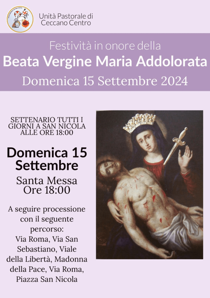 Secondo l’antica tradizione, attestata da 218 anni, si svolgerà oggi pomeriggio a Ceccano, 15 settembre, la processione dell’Addolorata che partirà dalla Chiesa di S. Nicola, per proseguire su via Roma, via S. Sebastiano, via Madonna della Pace e tornerà nella chiesa abaziale che l’ospita, veneratissima tra i fedeli. L’inizio è previsto per le ore 18. Il 15 settembre era anche la festa del Santa Maria della Pietà, l’ospizio psichiatrico di Ceccano, che ospitava anche una bella cappella con una pregevole scultura lignea. La cappella ora non c’è più, trasformata in normali locali ad uso sanitario, mentre la statua è ora esposta nella chiesa di S. Maria a fiume