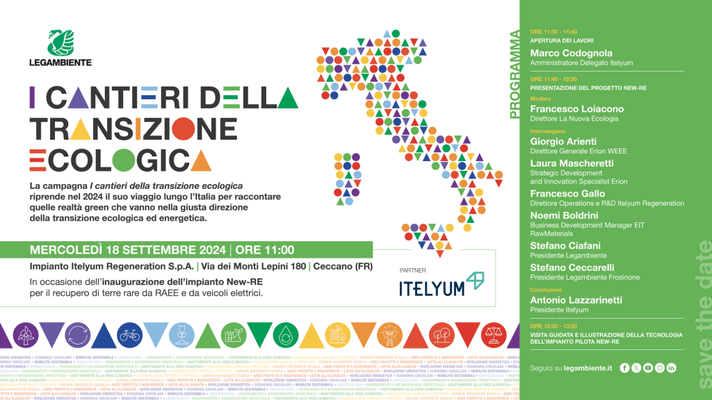 Legambiente ha scelto Ceccano per una delle tappe più significative del Cantiere della Transizione Ecologica, un censimento in continuo aggiornamento per raccontare come, nonostante tutto, l’Italia possa essere un faro per l’Europa. Così si legge nel sito della grande organizzazione ecologista che il 18 settembre metterà il suo cantiere a Ceccano, presso l’Itelyum, come oggi si chiama la raffineria che sorge ai margini del Bosco Faito e dell’autostrada, sulla Monti Lepini. Nello stabilimento, ci sarà l’inaugurazione dell’impianto per il recupero delle terre rare, indispensabili per gli impianti tecnologici di oggi. Il recupero sarà effettuato dai rifiuti elettronici e dai veicoli elettrici. Alle 11, i lavori saranno aperti da Marco Codognola, amministratore delegato dell’Itelyum, azienda leader in Italia nel riciclo degli oli usati e ora all’inizio dell’avventura sulle terre rare. Ci sarà poi una tavola rotonda di presentazione del nuovo impianto, moderata da Francesco Loiacono, direttore de La Nuova Ecologia, cui parteciperanno Giorgio Arienti, di Erion WEEE, Laura Mascheretti dello sviluppo strategico di Erion, Francesco Gallo, responsabile dell’impianto, Noemi Boldrini, del management dei materiali, Stefano Ciafani, presidente di Legambiente e Stefano Ceccarelli, presidente di Legambiente di Frosinone. Le conclusioni saranno tratte da Antonio Lazzarinetti, presidente di Itelyum