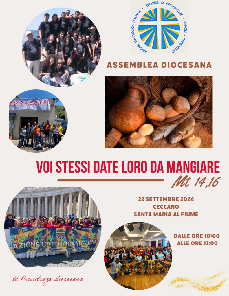 Voi stessi date loro da mangiare è lo slogan evangelico dell’Assemblea Diocesana dell’Azione Cattolica Italiana di Frosinone che si terrà a Santa Maria a fiume a Ceccano, domenica 22 settembre, ad iniziare dalle ore 10. I responsabili dell’Associazione si riuniranno per approvare l’Atto Normativo diocesano, che è il documento essenziale che norma la vita parrocchiale e diocesana dell’Associazione che conta oggi circa 500 soci. All’assemblea parteciperà la Delegata Regionale, Caterina Castagnacci.