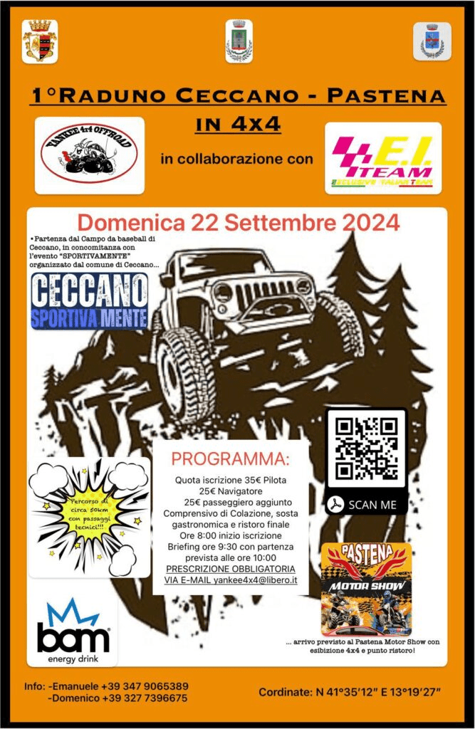 C’è anche un terzo evento, sempre patrocinato dal comune che ha dato il consenso all’utilizzo gratuito del campo da baseball Pinetto Bonanni, in questa domenica 22 settembre a Ceccano, oltre alla corsa podistica e al trekking. Si tratta del I raduno Ceccano Pastena in 4×4, dalla cui locandina, pubblicata sul sito di Palazzo Antonelli, si apprende che è inserito nell’evento Sportivamente del Comune di Ceccano. I fuoristrada si ritroveranno al campo da baseball da cui partiranno alle 10 per raggiungere Pastena, dove ci sarà l’esibizione all’interno del Motor Show.