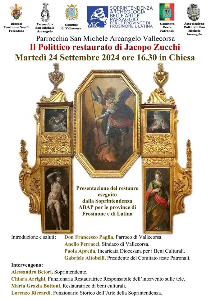 Torna nella sua chiesa, dopo un lungo restauro presso la Soprintendenza: al termine dei lavori è di nuovo a Vallecorsa, nella sua collocazione originaria, il Polittico di San Michele Arcangelo (XVI sec.), a firma del fiorentino Jacopo Zucchi, collaboratore principale del Vasari. Suoi quadri sono esposti alla Galleria Borghese, a Villa Medici. nel salone dei Cinquecento a Palazzo Vecchio. Gli interventi hanno consentito il recupero conservativo dell’opera, riportandone alla luce i colori perduti. L’opera restaurata verrà presentata al pubblico martedì 24 settembre alle ore 16:30 presso la chiesa di San Michele Arcangelo. Interviene in proposito Floriana Sacchetti, storica dell’arte, che, in un post su facebook scrive: Mi rivolgo ai giovani del mio paese. Queste opere, come altre presenti a Vallecorsa, ci appartengono. Esse racchiudono le nostre radici, quello che siamo stati, che siamo oggi e che vogliamo restare. Domani ore 16. 30 non perdete l’occasione di vedere il Polittico di Jacopo Zucchi restaurato e di ascoltare le parole di chi con passione e sensibilità lo ha portato a nuovo splendore e ad una nuova leggibilita’. Guardando e ascoltando pian piano nascerà in voi un sentimento: il piacere di sentire proprie le cose belle e la consapevolezza che difenderle é per il nostro bene e per il mondo intero che senza la bellezza scompare