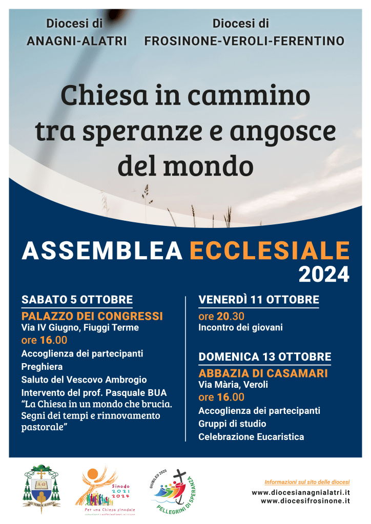 Da alcuni anni, secondo le indicazioni di Papa Francesco, i cristiani delle diocesi di Frosinone e Anagni riflettono insieme, tutti i battezzati, laici, consacrati e clero, per una più profonda comprensione del Vangelo e della missione della Chiesa. E’ l’esperienza del sinodo che è ascolto reciproco delle diverse voci e esperienze presenti nella Chiesa ma anche discernimento comunitario, un processo di riflessione e preghiera comune, volto a individuare la volontà di Dio per la Chiesa. A tutti è chiesto di contribuire con i propri doni e talenti alla vita della Chiesa. Il 5 ottobre a Fiuggi e il 13 a Casamari si interrogheranno sul rapporto tra la Chiesa e il mondo in cui è inserita, riflettendo sulla IV Costituzione del Concilio Vaticano II, la Gaudium et Spes. L’assemblea è aperta a tutti.