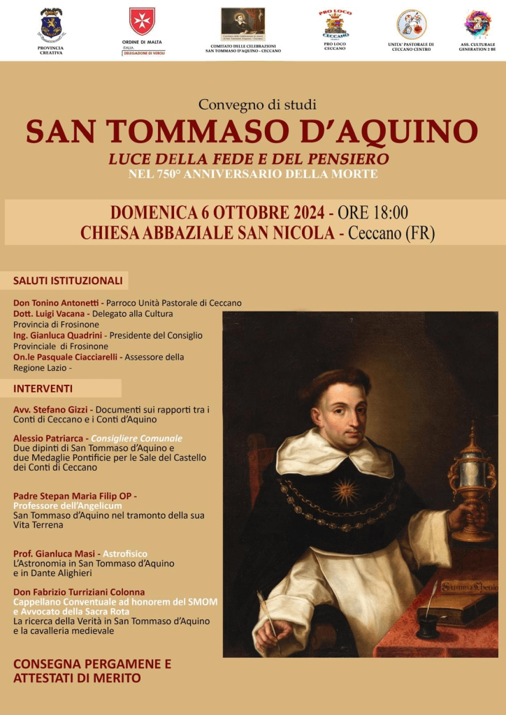 San Tommaso d’Aquino e i suoi rapporti con i Conti di Ceccano saranno al centro di un convegno che si terrà domenica 6 ottobre a Ceccano, nella Chiesa di S. Nicola, con inizio alle ore 18. Sono previsti numerosi interventi, come si può notare dal manifesto, fra i quali quello di Gianluca Masi, astronomo, sul sapere astronomico di Tommaso e la sua influenza sulla commedia dantesca.