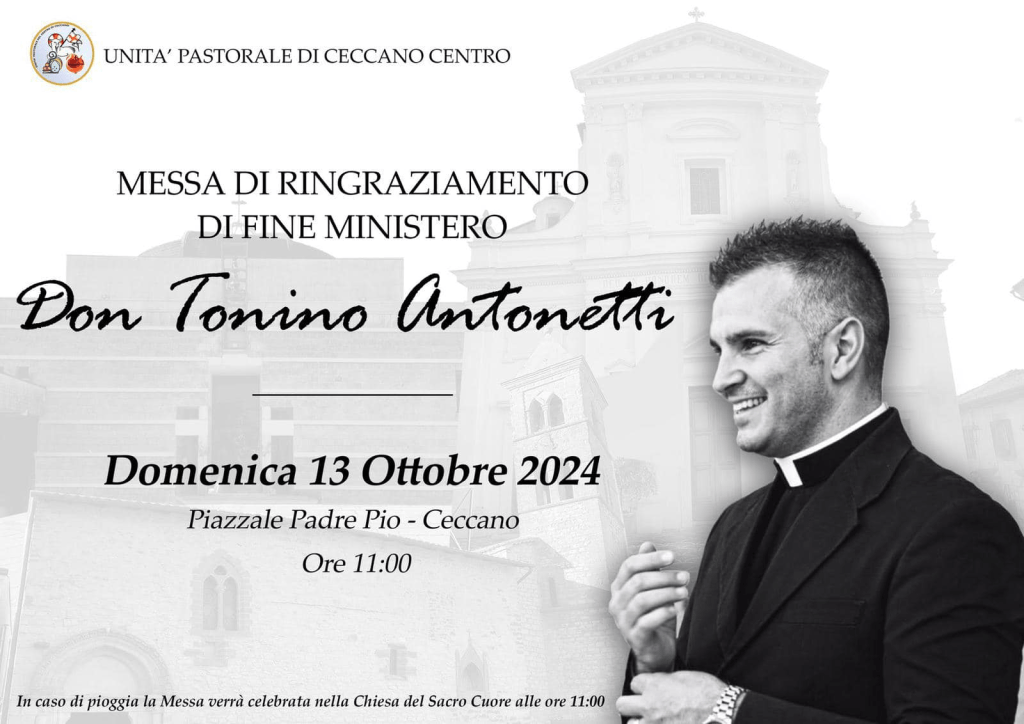 Si terrà all’aperto, a Piazzale Bachelet, a Ceccano, alle ore 11, la messa con cui le comunità parrocchiali del centro, S. Giovanni, San Nicola e Sacro Cuore, riunite appunto nell’Unità Pastorale, saluteranno don Tonino Antonetti, che nei prossimi giorni lascerà Ceccano per la concattedrale di Veroli. Gli succederà, nella guida pastorale delle parrocchie, don Italo Cardarilli, finora parroco ad Amaseno.