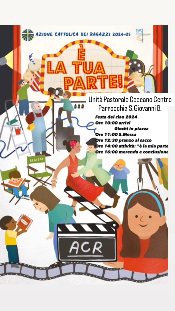 Si comincerà alle 10 con i giochi in Piazza S. Giovanni: è l’annuale appuntamento della Festa del ciao dell’Azione Cattolica dei Ragazzi di Ceccano, con il quale si avvia l’anno associativo. I ragazzi diventano protagonisti della loro educazione, fanno una grade esperienza di fratellanza e di carità , in un ambiente giocoso e sereno. La festa è aperta a tutti i bambini e i ragazzi che volessero partecipare.