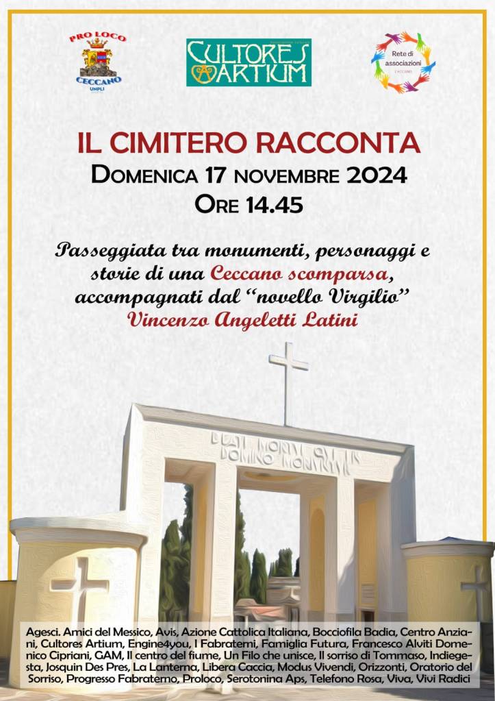 Mille storie che nascono da quei nomi, quei simboli, quelle cappelle che costellano il cimitero monumentale di Ceccano, ben diverso dalle nuove cappelle “simil bar” che crescono, come funghi, lungo il viale del nuovo cimitero: sono storie che parlano della vita e della morte, della fede, del dolore, ma anche delle imprese, dell’umanità di tutte quelle persone che il cimitero ricorda con le sue tombe. Sarà Vincenzo Angeletti Latini, architetto ed appassionato cultore della storia di Ceccano, ad accompagnarci in una visita, ricca di storie coinvolgenti, domenica 17 novembre con inizio alle ore 14,45. L’iniziativa è dell’associazione Cultores Artium, insieme alla Pro loco e alla Rete delle Associazioni.