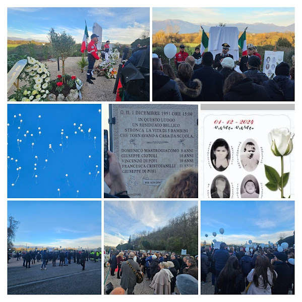 Un no a tutte le guerre, è il senso del comunicato stampa con cui la Pro loco di Ceccano commenta la bella cerimonia dell’inaugurazione del monumento in ricordo dei 5 bambini di Callami. Sono stati tantissimi i cittadini e le autorità che hanno partecipato all’inaugurazione del monumento dedicato ai Bambini di Callami, morti a causa dell’esplosione di un ordigno bellico, il 1 dicembre del 1951 a Ceccano – si legge nel comunicato – Il monumento è stato voluto dagli abitanti della contrada, coordinati da Salvatore Masi, vera anima della commemorazione. Fu uno dei giorni più tristi della comunità ceccanese, la notizia ebbe eco anche sulle pagine dei giornali nazionali come la Stampa e il Corriere ed è stata fatta conoscere ai ceccanesi grazie alla ricostruzione storica di Angelino Loffredi. Ora dopo 73 anni proprio, nelle vicinanze del luogo dove avvenne la tragedia c’è un monumento dedicato a loro e a tutti i bambini innocenti vittime delle guerre.