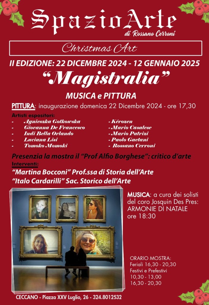 Il senso del Natale nei diversi linguaggi della pittura e della musica. A Ceccano, domenica 22 dicembre, alle ore 17,30, presso lo Spazio Arte di Rossano Cerroni, in Piazza 25 Luglio, al n. 26, ci sarà l’inaugurazione di Magistralia, esposizione di opere di Agniezska Gotkowska, Giovanna De Francesco, Indi Bella Orlando, Luciana Lisi, Tomoko Momoki, Kérozen, Mario Casalese, Mario Patrizi, Paolo Gaetani, Rossano Cerroni. Il vernissage avverrà alla presenza del critico d’arte, Alfio Borghese. Ci saranno poi gli interventi di due storici dell’arte, Martina Bocconi e don Italo Cardarilli. Al termine, nella vicina Chiesa di S. Sebastiano, in Piazza Municipio, la serata sarà conclusa dai solisti del Coro Josquin Des Pres che presenteranno la Missa brevis di Gabriel Fauré. Canteranno Vittoria D’Annibale, Cinzia Cristofanilli, Veronica Spinelli, Fabiola Mastrogiacomo, Anita Bartoli, Enrico Talocco, accompagnati all’organo da Chiara Olmetti, diretti da Guido Iorio. L’iniziativa si svolge con il patrocinio del Comune di Ceccano, della Proloco con la Rete delle Associazioni di Ceccano