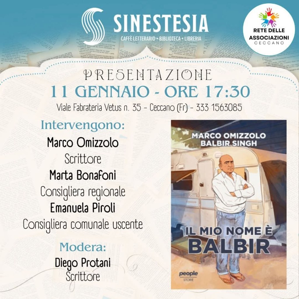 Si svolgerà sabato 11 Gennaio alle ore 18, presso il caffè letterario Sinestesia a Ceccano la presentazione del libro Il mio nome è Balbir edito da People. Ci sarà l’autore Marco Omizzolo, giornalista, protagonista di tante inchieste sullo sfruttamento dei lavoratori nella pianura pontina.