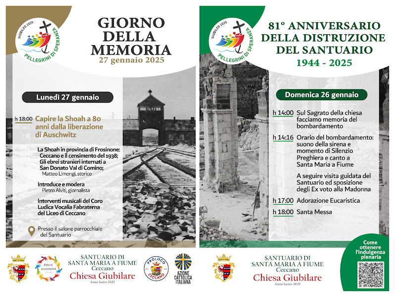 A colloquiare con lei e con il pubblico presente saranno il critico letterario Rino Caputo e la musica di Ludovica Talocco, al pianoforte. Il 27 gennaio, Giornata della Memoria, alle ore 18, presso il Salone parrocchiale del Santuario di Santa Maria a Fiume, Matteo Limongi, storico, ci parlerà della Shoah in Provincia di Frosinone, del censimento avvenuto a Ceccano nel 1938, con la denuncia da parte del podestà, dei quattro ebrei ricoverati in manicomio, e degli ebrei internati a San Donato Val di Comino, protetti, invece dalla popolazione, podestà in testa, a rischio della propria vita. Nel corso dell’evento, in cui si cercherà di capire anche i meccanismi dell’economia concentrazionaria ad 80 anni dalla liberazione di Auschwitz, avvenuta appunto il 27 gennaio 1945, ci saranno interventi musicali a cura del coro Ludica Vocalia Fabraterna del Liceo Scientifico di Ceccano.