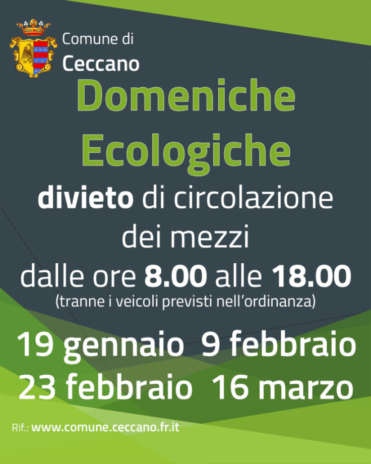 Terza domenica ecologica a Ceccano, secondo le disposizioni del Commissario straordinario. Il divieto sarà in vigore dalle 8 alle 18. Potranno circolare liberamente i veicoli a basso impatto ambientale: elettrici, ibridi, metano, gpl, diesel con filtro antiparticolato.