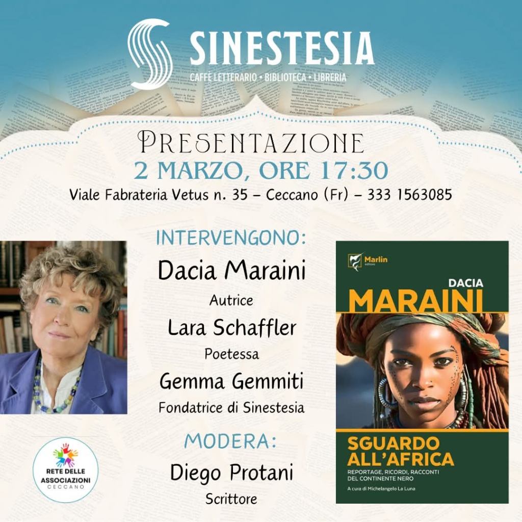 La rete delle associazioni di Ceccano dimostra di puntare sulla cultura con tutte le proprie forze. Si svolgerà domenica 2 Marzo alle ore 17.30 presso il caffè letterario Sinestesia l’attesissimo incontro con Dacia Maraini che presenterà il suo libro Sguardo all’Africa edito da Marlin Editore. Con questo libro si completa la trilogia di Dacia Maraini dedicata ai suoi viaggi in Asia, in America e in Africa. L’Africa è il continente più amato dalla nota scrittrice italiana, quello per cui ha scritto molti reportage, pagine narrative e persino un documentario “Ritratti delle donne africane”, girato in Costa d’Avorio e trasmesso dalla RAI nel 1977. L’Africa è anche il continente più visitato insieme agli inseparabili amici Alberto Moravia e Pier Paolo Pasolini, che lo consideravano uno dei luoghi più importanti per la loro ricerca e per loro produzione artistica. Oltre a essere un resoconto dei viaggi compiuti in Etiopia, Kenya, Somalia, Egitto, Costa d’Avorio, Marocco, Algeria, Sudan, Nigeria e altri, la Maraini tratta con passione temi rilevanti per molte popolazioni africane, come la guerra civile, la carestia, il colonialismo, l’ingiustizia sociale, la prostituzione, l’infibulazione, ecc. mettendo, come sempre, in risalto la difficile condizione e il ruolo importante delle donne nella famiglia e nella società.