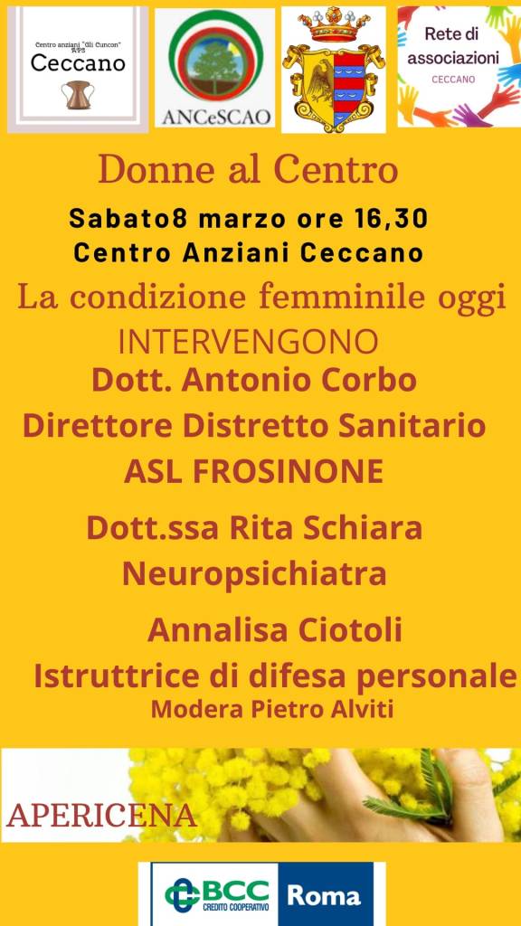 L’8 marzo al Centro Anziani di Ceccano, un pomeriggio di riflessione e di festa per celebrare la Giornata dedicata alle donne: interverranno Antonio Corbo, medico, direttore sanitario del Distretto B di Frosinone, Rita Schiara, neuropsichiatra, e Annalisa Ciotoli, istruttrice di difesa personale. L’incontro inizierà alle 16,30 presso la sede del Centro Anziani di Ceccano, che ha organizzato la manifestazione in collaborazione con la Proloco e la Rete delle Associazioni.