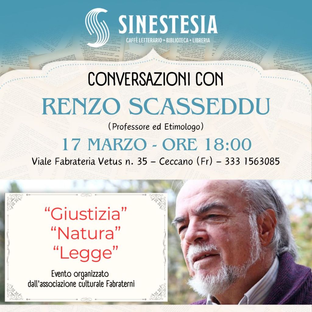 Un altro appuntamento di gran pregio al caffè letterario a Ceccano: lunedì 17 marzo, alle ore 18, Renzo Scasseddu, etimologo, discuterà con i presenti intorno a tre tematiche fondamentali della cultura occidentale: Giustizia, Natura e Legge, partendo dalle etimologie greche dei tre termini, svelando in questa maniera interessanti radici che fondano i valori della nostra società. La manifestazione è organizzata dall’Associazione Fabraterni.