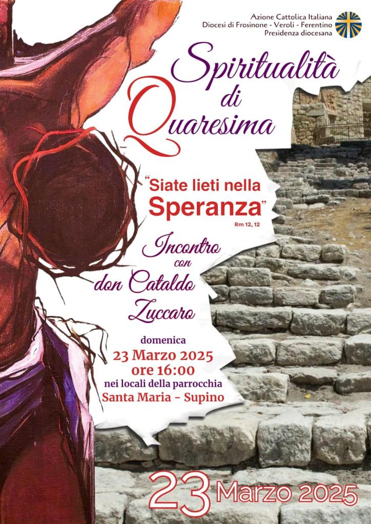 Sarà don Cataldo Zuccaro, assistente del Movimento Ecclesiastico di Impegno Culturale e ordinario di teologia morale fondamentale nella Facoltà di teologia della Pontificia Università Urbaniana di Roma e Consultore della Congregazione per la Dottrina della Fede, a guidare la giornata di spiritualità quaresimale che l’Azione Cattolica della diocesi di Frosinone terrà domenica 23 marzo 2025 a Supino, alle ore 16, nei locali della Chiesa Collegiata di S. Maria. L’incontro è aperto a tutti coloro che vogliano dedicare un po’ di tempo alla preparazione alla Pasqua. Don Cataldo Zuccaro fu viceparroco a S. Giovanni a Ceccano negli anni 70.