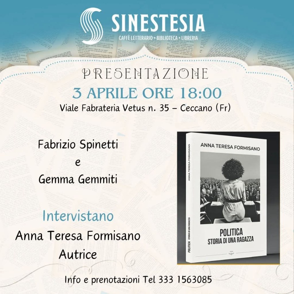 Fabrizio Spinetti e Gemma Gemmiti intervisteranno Anna Teresa Formisano, mercoledì 3 aprile, alle ore 18 al caffè letterario. Nata a Cassino il 25 marzo del 1956, dopo la licenza liceale al classico Carducci, si è laureata in giurisprudenza all’Università Federico II di Napoli e successivamente specializzata in Organizzazione Aziendale presso la Scuola Superiore della Pubblica Amministrazione. Dal 1968 al 2013 impegnata attivamente in politica ricoprendo ruoli prima in Amministrazione comunale e provinciale poi alla Regione Lazio e alla Camera di Deputati. Da sempre impegnata per la crescita culturale, sociale nel suo territorio, oltre attività di sostegno a favore delle donne, è proprio per questo, nel 1985 fonda la sezione F.I.D.A.P.A. di cui diventa Presidente per quattro anni. Presenterà il suo libro Politica, Storia di una ragazza.