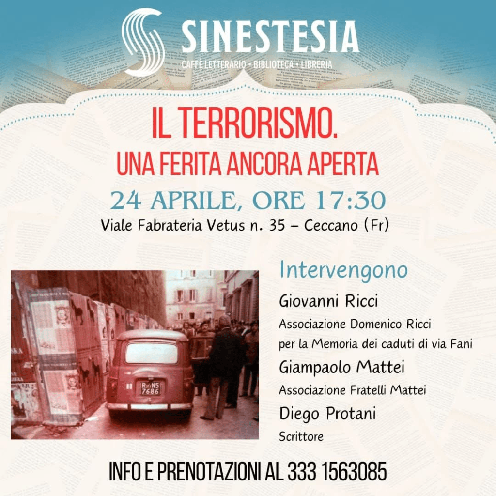 Il prossimo 24 aprile Giampaolo Mattei sarà a Ceccano per partecipare ad un evento dal titolo “Il terrorismo. Una ferita ancora aperta”, presso il Caffè Letterario Sinestesia, con inizio alle 17:30. Sarà presente anche Giovanni Ricci, dell’Associazione Domenico Ricci e per la memoria ai caduti di via Fani, e lo scrittore ceccanese Diego Protani. Sia Mattei che Ricci sono tra le vittime del terrorismo: il primo vide morire due suoi fratelli nell’incendio di un’abitazione a Primavalle. Il secondo è il figlio di Domenico Ricci, ucciso dalle Brigate Rosse a via Fani, mentre era di scorta all’onorevole Moro.