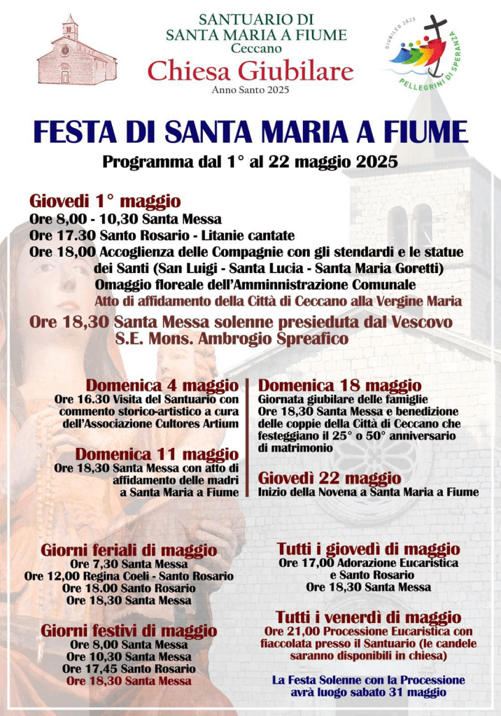 Il mese di maggio è tradizionalmente dedicato alla venerazione di Maria, madre di Dio. Questa sera, alle ore 18, nel Santuario lungo le rive del fiume Sacco arriveranno le compagnie delle diverse contrade, e ci sarà l’omaggio dal parte del Commissario. Insieme alle compagnie arriveranno anche, processionalmente, le statue dei santi delle contrade: quella di S. Luigi partirà alle 16,30, quella di Santa Maria Goretti alle 17 e le due processioni si uniranno in compagnia all’incrocio del vivaio per arrivare a S. Maria a fiume. Alle 17,45 partirà la processione dalla chiesetta di S. Lucia, da via Badia la compagnia partirà alle 17,30. e poi tutte assieme alle 18 raggiungeranno il santuario, chiesa giubilare. Le compagnie avranno il loro stendardo. Tutto è stato deciso nel consiglio pastorale. Alle 18,30 ci sarà la messa, presieduta dal vescovo, mons. Spreafico.