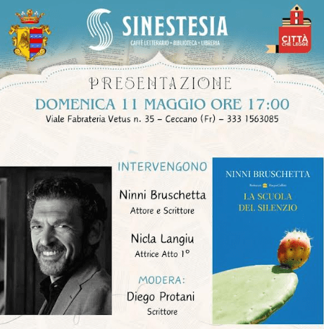 Appuntamento da non perdere al caffè letterario Sinestesia di Ceccano. Domenica 11 Maggio alle ore 17.00 si terrà la presentazione del libro di Ninni Bruschetta “La scuola del silenzio”.