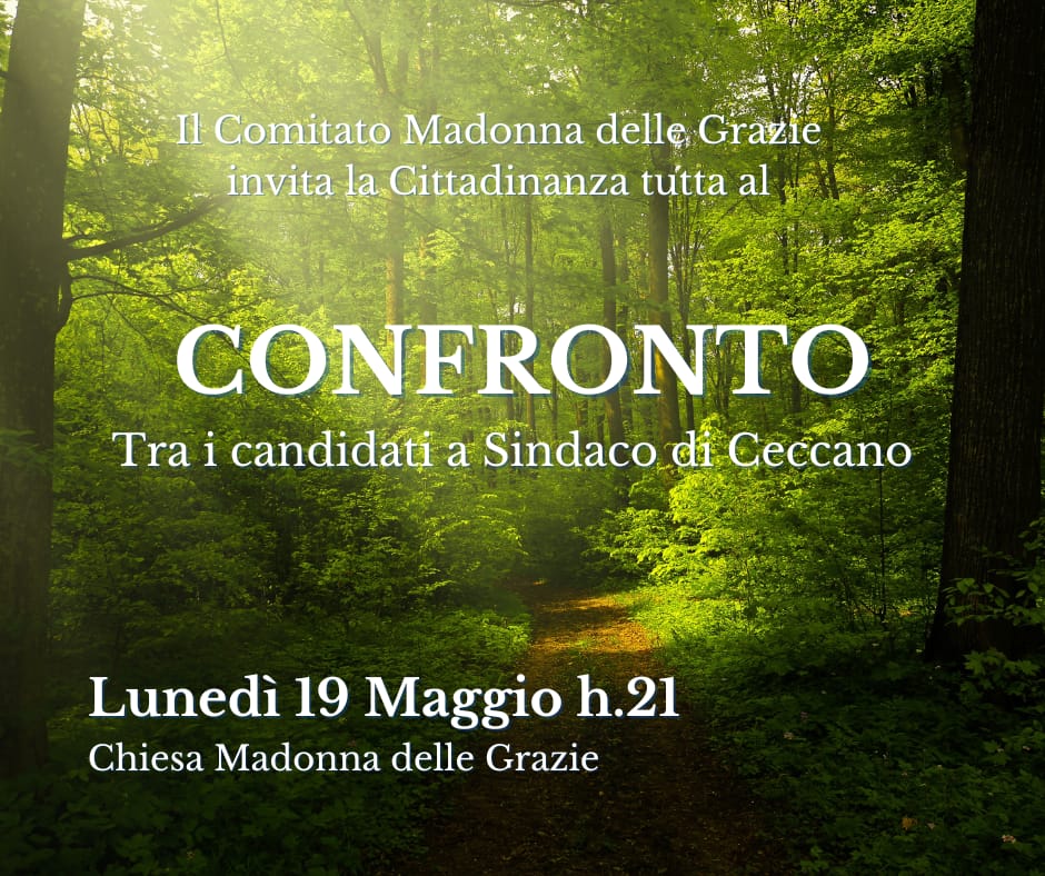 Lo organizza il comitato Madonna delle Grazie che invita tutta la cittadinanza a partecipare all’incontro tra i candidati a Sindaco che si terrà il giorno lunedì 19 alle ore 21 presso la Chiesa della Madonna delle Grazie. In un comunicato scrivono che sarà un’occasione di confronto e di dibattito sulla situazione della contrada e della nostra amata Ceccano, su come risolvere i problemi e valorizzare i punti di forza. Ci tenevamo particolarmente ad ascoltare proposte, promesse e progetti dei candidati ad amministrarci, per prendere coscienza direttamente degli orientamenti che la prossima Amministrazione andrà ad assumere.