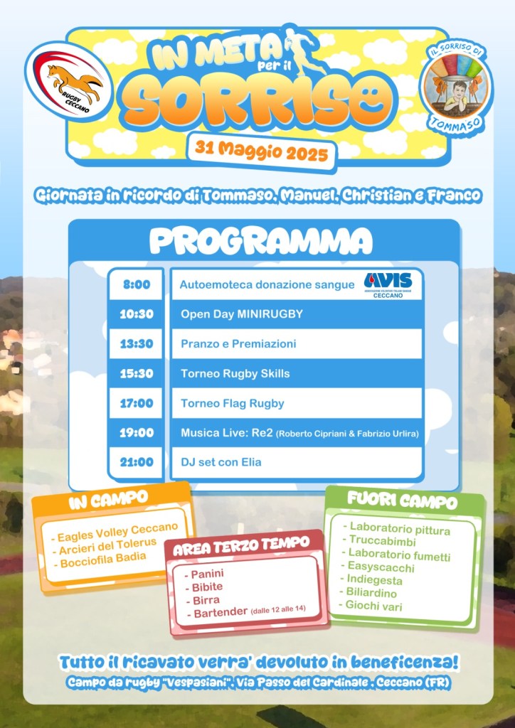 Per il 31 maggio l’Associazione “il sorriso di Tommaso” insieme al Ceccano rugby Fabraternum, guidato dal suo nuovo presidente Marco Pasin, organizza una giornata di sport, amicizia e solidarietà, in ricordo del piccolo Tommaso, di Manuel, Christian, Franco e di tanti altri bambini che ci hanno lasciato prematuramente. Al mattino ci sarà l’autoemoteca dell’Avis per la donazione del sangue e a seguire durante tutta la giornata ci saranno varie attività a cui parteciperanno anche Indiegesta, l’Eagles volley Ceccano, gli arcieri del Tolerus, la bocciofila Badia e Easy scacchi. Ci saranno anche attività non sportive per i bambini, come il laboratorio di pittura, il laboratorio di fumetto e giochi di vario genere. Seguirà dalle 19:00 un’esibizione di musica live con i Re2 (Roberto Cipriani e Fabrizio Urlira). Ci sarà l’area terzo tempo, con riferimento al rugby per quel momento dopo la partita in cui i giocatori delle due squadre fraternizzano fra loro, aperta tutto il giorno con panini, patatine, bevande di vario genere e dalle 12:00 alle 14:00 anche un barman per i cocktail . Insomma ce n’è un po’ per tutti i gusti. Il ricavato della giornata (che deriverà dalla vendita di panini e bibite oltre che da offerte libere) andrà ad arricchire la donazione che ogni anno viene destinata ad un progetto sempre diverso in favore dei piccoli pazienti dell’oncoematologia pediatrica.