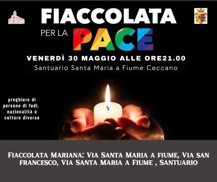 Venerdì 30 maggio, anniversario della battaglia di Ceccano del maggio 1944, a Santa Maria ci sarà la fiaccolata per la pace, che si snoderà attorno al santuario con la testimonianza e la preghiera di persone di fedi, nazionalità, culture diverse. La fiaccolata percorrerà via Santa Maria a fiume, via S. Francesco e poi rientrerà al santuario, chiesa giubilare.