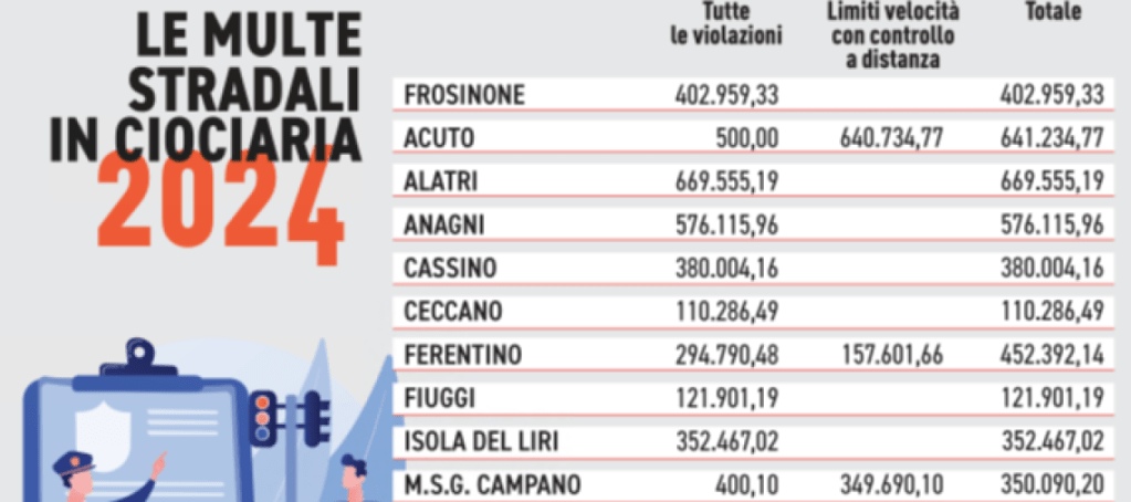 Il Comune di Acuto, nel 2024, ha incassato dagli autovelox più di 640 mila euro. Lo segue a ruota Monte S. Giovanni nelle cui casse sono arrivati 350 mila euro dalle multe dell’autovelox sulla via Maria. Sul podio anche Ferentino che nel 2024 ha incassato quasi 160 mila euro. I vigili più severi sono ad Alatri, il cui municipio vanta ben 670 mila euro di incassi dalle multe, seguito da Anagni che si ferma a 576. Molto lontani Frosinone, 402 mila, Cassino, 380, Isola del Liri, 352. Ceccano si limita a 110 mila euro.