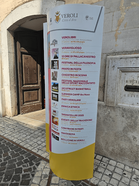 Nella foto vedete il cartellone di Veroli ma ne trovereste di simili per Ferentino, Anagni, Alatri, Sora ma anche per centri molto più piccoli. L’iniziativa dei due neo assessori Ciotoli, alla cultura, e Ruggiero, alle associazioni, di fare appello a tutti proprio per stilare un cartellone di appuntamenti per l’estate di Ceccano, costituisce una novità sostanziale rispetto al passato. Forse anche Ceccano riuscirà ad avere un suo cartellone di eventi.