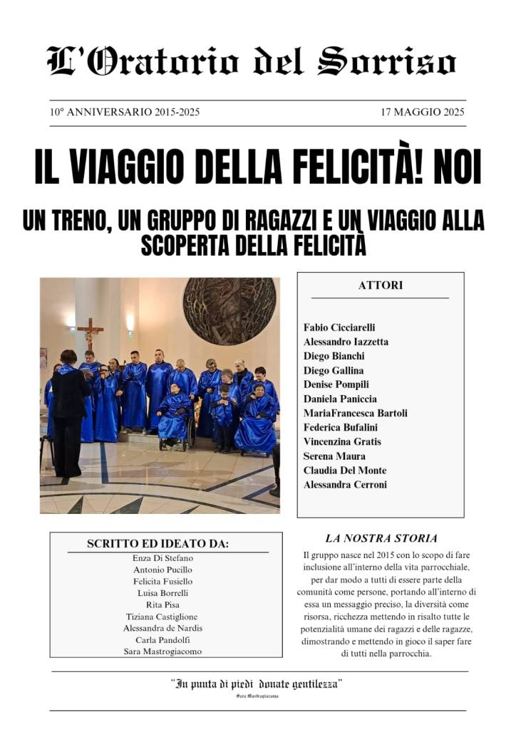E’ quello che ci faranno fare stasera, martedì 17 giugno, i giovani ragazzi dell’Oratorio del Sorriso, nel decennale di fondazione dell’opera che si occupa di favorire l’integrazione e l’inclusione. Un treno, un gruppo di ragazzi e un viaggio.