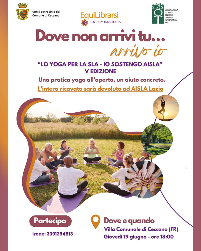 Dove non arrivi tu…arrivo io” con collaborazione, complementarietà e coraggio. E’ lo slogan con cui Equilibrarsi sostiene Aisla, l’associazione per il sostegno ai malati di SLA. e lo farà a Ceccano il 19 giugno, per la quinta edizione, de *“LO YOGA PER LA SLA – IO SOSTENGO AISLA”. Quest’anno l’evento si svolgerà presso la Villa Comunale di Ceccano a partire dalle ore 18. Ci sarà una pratica yoga, accessibile a tutti. L’intero ricavato andrà in favore di Aisla Lazio